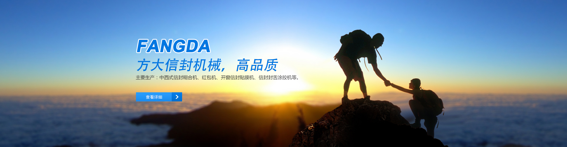 瑞安方大信封机械有限公司,是专业生产信封机糊合设备系列产品的企业,主要产品有:中西式信封糊合机、红包机、开窗信封贴膜机、信封封舌涂胶机等。实力来自规模,品质源自专业。我厂拥有专业老练的工程设计人员,经验丰富的生产安装人员,严谨认真的质量检验人员,从而保证了所生产机械的优良品质。此外,我厂也将从技术上、性能上不断改进提高,以更好的满足客户的需求。“客户至上,服务为本”是我厂长期一贯的服务理念,从安装、测试、保养、维修等售后服务,我们会给予客户充足的信息资讯与技术支持,因此在业界获得良好的口碑及信誉,您的满意是我们的荣耀!欢迎您来电查询、来人参观,我们一定能给你满意的答复!秉承“顾客至上,锐意进取”的经营理念,坚持“客户为先”的原则为广大客户提供温馨的服务。欢迎惠顾!